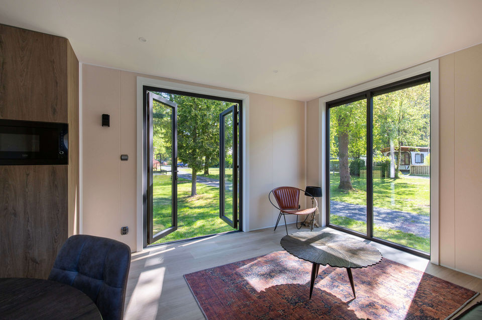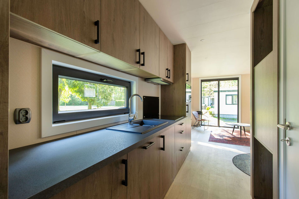 Dit dubbel brede chalet biedt een gevoel van ruimte en luxe, met een stijlvolle indeling die perfect past bij een modern leven. De open keuken is voorzien van een keukeneiland, wat niet alleen praktisch is, maar ook zorgt voor een gezellige sfeer om te koken en te entertainen. Het chalet beschikt over drie slaapkamers, waarvan er één flexibel in te richten is als bijvoorbeeld een werkkamer, ideaal voor het combineren van wonen en werken. Verder is er een apart toilet en een ruime badkamer met een tweede toilet, waardoor er genoeg comfort is voor het hele gezin. De grote raampartijen zorgen niet alleen voor veel natuurlijk licht, maar creëren ook een open en luchtige sfeer in het hele chalet. De scheiding tussen de slaapkamers en het woongedeelte van dit chalet biedt niet alleen extra privacy, maar creëert ook een duidelijke indeling die de ruimte functioneel en comfortabel maakt. Deze scheiding zorgt ervoor dat het woongedeelte, met zijn ruime keuken en gezellige zit- en eetruimte, een rustige plek blijft voor sociale interactie en ontspanning, terwijl de slaapkamers als privéruimtes behouden blijven. Het maakt het chalet ideaal voor gezinnen of gasten die behoefte hebben aan een aangename en gescheiden indeling van leef- en slaapruimtes.