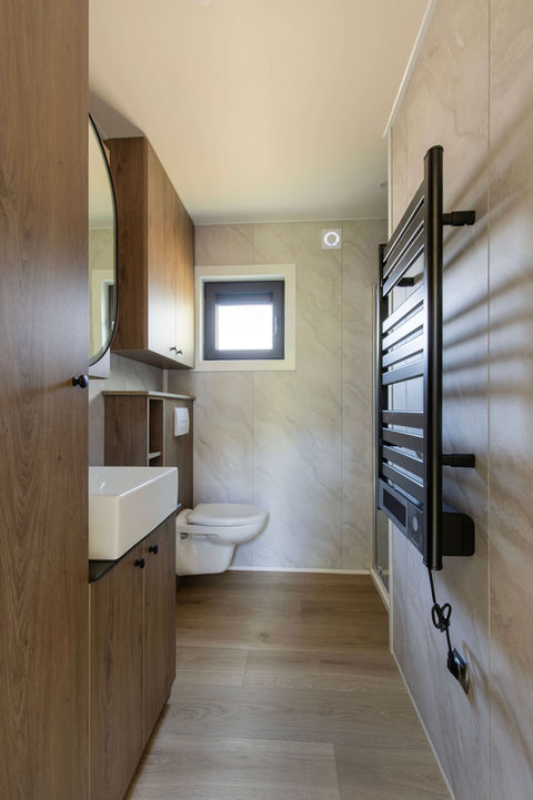 Het chalet Specht is een charmante en goed geïsoleerde woning van 11 x 3,8 meter, perfect voor een comfortabele en gezellige levensstijl. Dit stijlvolle chalet biedt twee gezellige slaapkamers, een moderne badkamer en een goed uitgeruste keuken. Dankzij de hoogwaardige isolatie ben je het hele jaar door verzekerd van een aangename temperatuur, zowel in de winter als de zomer. De slimme indeling zorgt voor optimaal gebruik van de ruimte, waardoor het chalet niet alleen praktisch is, maar ook een warme en uitnodigende sfeer uitstraalt. Een ideale keuze voor wie op zoek is naar comfort in een compact, maar volledig uitgeruste chalet.